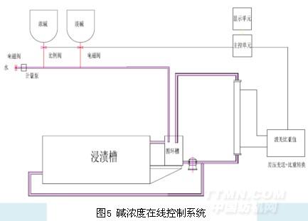 利用比重法間接測量工藝液中較高濃度的堿溶液的濃度值,自動實現在線閉環控制,無需人工干預;對于低濃度的堿溶液則采用自動滴定方式測量并實現閉環控制。間接測量堿濃度的方法性能穩定,維護簡單,持久耐用,檢測探頭不易損壞,為較理想的濃度檢測法。如圖5所示: