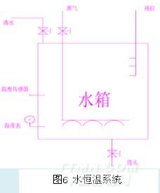 該裝置用于控制水溫,用蒸汽對冷水加熱,將水溫控制在工藝溫度要求范圍內。水箱容量基本配置為1噸,具體可按用戶要求作相應改變。水箱內配有溫度表,溫度傳感器,液位計,散熱器等,由PLC實現數據的采集與控制。如圖6所示。