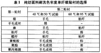 混紡面料的第一塊單纖維貼襯選用面料組成中的主要纖維;第二塊貼襯選用面料組成中的次要纖維以滌/棉/腈(50/40/10)混紡面料為例,其耐洗色牢度的第一貼襯為滌綸,第二貼襯為棉]。純紡面料的第一塊單纖維貼襯選用同類纖維,第二塊貼襯按表1選擇。