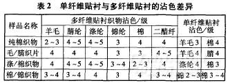 多纖維貼襯系由多種纖維組合而成,因其結(jié)構(gòu)、紗和密度與單纖維貼襯不同,所以沾色效果也不同。常用的SDC多纖鄰布DW為例,按GB/T3921A(1)法試驗,比對結(jié)果見表2。