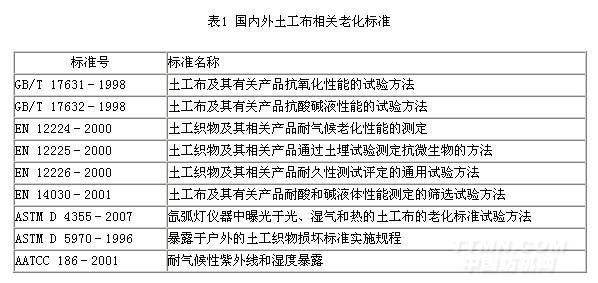常見的實驗室老化試驗主要有光照老化、濕熱老化、熱風老化等。目前國內外常用的土工布老化標準如表1所示。