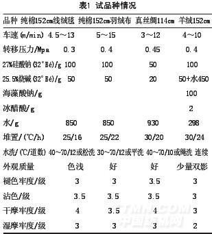 無錫市的色織廠引進了該機,從Dansk公司提供的400多個樣布看,無論在品質或圖案質量上,均達到國際一流水平。按照正常工藝要求在20℃以上的室溫下進行轉移印花,并在40℃以上的溫濕狀態堆置。該廠試生產是在0℃左右進行的,在一定程度上影響了產品質量效果。試品種情況見表1