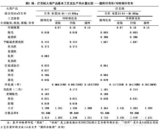 表2中就印花工藝對比,圓網印花工藝的水、電百米消耗量最高,萬元產值的水、電消耗量更高,說明其它三種印花產品附加值高。