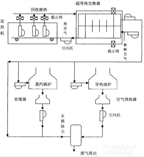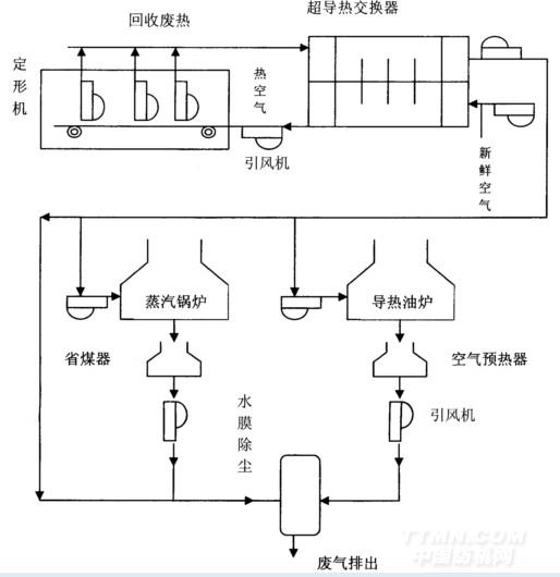 定形機廢熱→超導熱交換機→引風機→導熱油爐、蒸汽鍋爐(熱空氣再供定形機)→水膜除塵→廢氣廢熱鍋爐(油爐)煙囪排出。