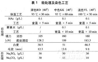 以65%棉/35%竹混紡紗作為原料,直接采用純棉的工藝加工,對(duì)不同紗支、不同顏色進(jìn)行前處理及染色(表1)。