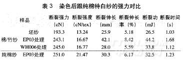 采用兩種不同的前處理工藝,染色后跟純棉特白紗進(jìn)行強(qiáng)力對(duì)比,測(cè)試結(jié)果見表3。