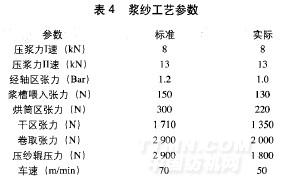 由于竹漿纖維良好的伸長(zhǎng)率,棉/竹紗易伸長(zhǎng),但回復(fù)性能低,故棉/竹混紡紗漿紗路線基本采用低張力、少伸長(zhǎng)的原則,漿紗過(guò)程各區(qū)張力都比正常工藝降低,主要工藝參數(shù)見表4。