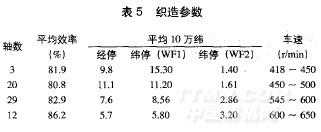 織造工藝應采取合適的溫濕度、較小的開口和上機張力。上機工藝為:張力160kg,環境溫度26.5℃,環境濕度53.9%,工藝送風關閉。車速設在418~650r/min之間,表現為毛羽稍多,經紗稍有粘連,10萬緯經緯停稍多(表5),總體比100%棉紗略差,但生產基本正常。