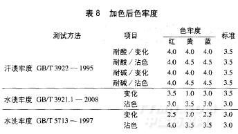 從表8可以看出,其中水洗、水漬變色牢度較差,原因如下。