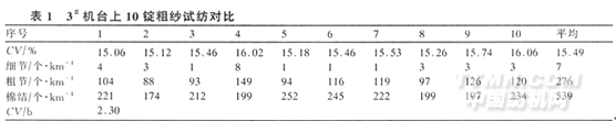 前紡半制品質(zhì)量尤其是粗紗質(zhì)量的好壞,對(duì)成紗半制品質(zhì)量具有至關(guān)重要的影響;如果粗紗條干不勻,錠間、臺(tái)間差異大,將會(huì)嚴(yán)重惡化成紗條干。我們?cè)鴮?duì)兩臺(tái)粗紗機(jī)所紡粗紗進(jìn)行同錠試紡,其試驗(yàn)結(jié)果見表