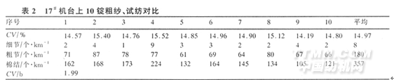 由試驗(yàn)結(jié)果可以看出,用17#車的粗紗,其成紗質(zhì)量明顯優(yōu)于3#車的粗紗;3#車粗紗的差異給細(xì)紗條干CVb值造成嚴(yán)重影響;因此,必須盡最大可能提高粗紗質(zhì)量,減小粗紗臺(tái)間、錠間差異,建立嚴(yán)格的粗紗質(zhì)量把關(guān)制度,嚴(yán)防疵品流人下工序。