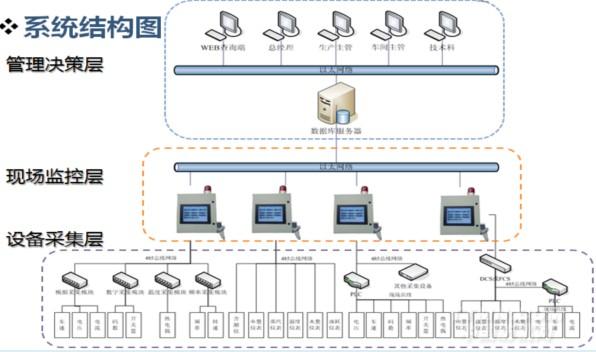 生產過程通過各種采集模塊將傳感器采集的數據上傳到現場監控端和管理決策端,實現生產異常報警、在線質量監視,實時掌握車間生產過程狀態,在次品發生早期做出正確的修正措施,確保工藝參數穩定可靠。