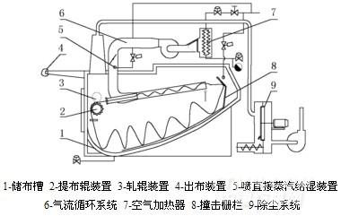 氣流柔軟整理機的工作原理,必須借助必要的結構和控制功能來實現。每個結構既有自身的作用特點,同時又有與其它相關結構的協調關系,只有這樣才能夠組合成為一個有機整體,共同完成工作的全過程。圖2為機器的結構示意圖?,F對主要結構功能進行分析。