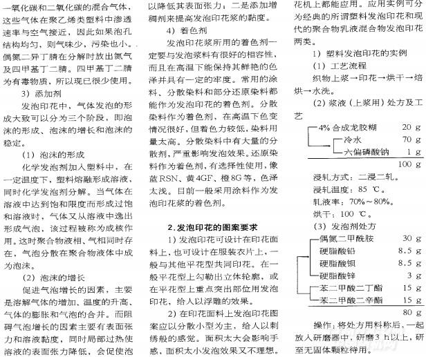 化學發泡劑的種類很多,約有1 ooo~0以上,但適宜于織物發泡印花漿的發泡劑并不多,因為 作為織物發泡印花漿要有一定的 分解溫度和發氣量。
