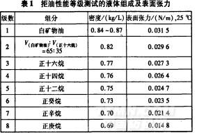 參照AATCCl 18--2002(FZ/T01067—1999)《拒油性耐碳?xì)浠衔镌囼灐贰>苡托苑?級,l級最差,8級最好。拒油整理液組成及表面張力見表l。