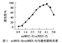 與AEO系列相比,有原料便宜、低泡、對油脂增溶能力強等特點.另外,MEE的皮膚刺激性比AEO小,更易生物降解.基于上述原因,選用MEE系列表面活性劑中的MEE一8與MEE一5按一定比例復配用于高粘度氨基硅油乳化,最終得到一組乳化效果較好的配比.由圖1可知,當m(MEE一8):m(MEE一5)=4:1時所得微乳液的透光度最好,且微乳液體系均勻無漂油.所以乳化劑復配比選擇m(MEE一8):m(MEE一51=4:1.