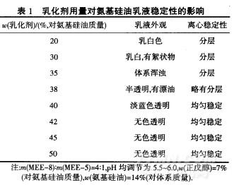由表l可見,當乳化劑用量較少(<4O%)時,只能形成乳狀液,離心穩定性差.微乳液形成原因之一是表面活性劑的膠束溶液對油或水的增溶作用.當乳化劑用量較少時,硅油不能完全被增溶,易形成粒徑較大的乳狀液;乳化劑用量40%時得到穩定的氨基硅油微乳液,但顏色不如乳化劑用量42%得到的微乳液,考慮成本,選擇乳化劑用量42%.