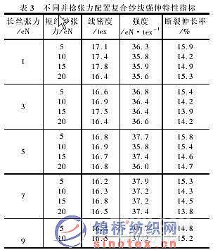 無捻長絲和 S 捻短纖紗在按 Z 向并捻時的張力配置及對應(yīng)的復(fù)合紗線的強伸特性見表 3,其復(fù)合捻度為 120 捻 /10 cm。