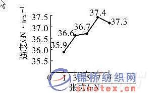 復(fù)合紗線的強度與長絲并捻張力之間的關(guān)系見圖 1。