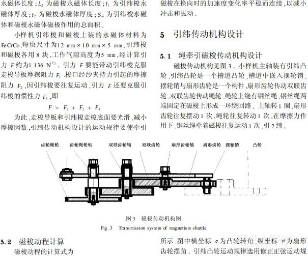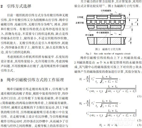 繩牽引磁梭引緯機構在其它織機中有應用,但其梭實為夾緯器,所織布邊為毛邊,且夾緯器空程太大。本文介紹的繩牽引磁梭引緯機構的空程極小,能織出光邊布。本文還探討了磁引力計算方法,對機織小樣機的設計更新具有現實意義。