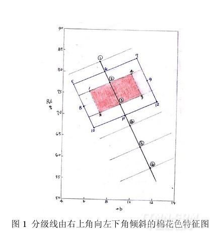 作者在“論棉花色特征的綜合評定”一文中:明確指出中國棉花色特征圖中的分級線由左上角向右下角傾斜是錯誤的;提出符合GB1103--2007《棉花細絨棉》中,關于對各級色特征的文字說明的分級線,應該是由右上角向左下角傾斜。為此,在本論點,現按下列四個方面逐步分析說明。