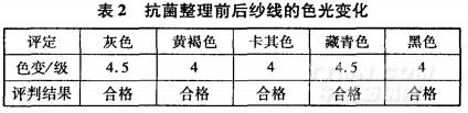 采用工藝 1分別對(duì)灰色、 黃褐色、 卡其色、 藏青色和黑色色紗進(jìn)行抗菌整理, 測(cè)定整理前后紗線的色變情況 , 結(jié)果見表 2 。