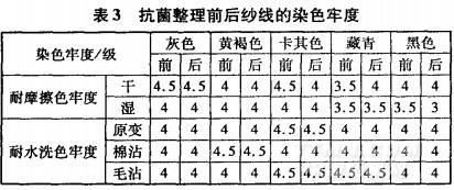 測(cè)定抗菌整理前后紗線的耐摩擦色牢度和耐水洗色牢度, 結(jié)果見表 3 。