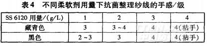 將抗菌整理后的色紗與常規(guī)絲光棉紗線進(jìn)行對(duì)比,結(jié)果表明,抗菌整理后紗線的手感較硬、較澀,這主要是由于抗菌劑 B D 3 S優(yōu)先吸附于紗線表面, 阻礙了紗線對(duì)柔軟劑的吸附; 同時(shí)由于抗菌劑 B D 3 S烘干時(shí)會(huì)形成固化薄膜, 造成紗線發(fā)硬。 為了改善紗線手感, 改變改性氨基硅油類柔軟劑( S S 6 1 2 0 ) 用量 , 按工藝 1進(jìn)行整理 , 測(cè)定整理后紗線的手感 , 結(jié)果見表 4 。