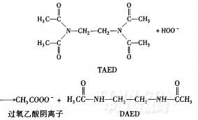 在漂液中加入TAED,其可與H2O20一發(fā)生親核取代反應(yīng)生成過氧乙酸陰離子和二乙酰乙二胺(DAED)引,其反應(yīng)如下所示: