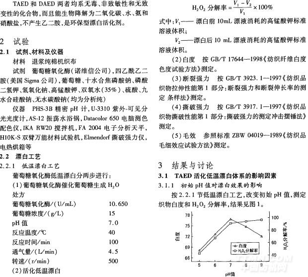 葡萄糖氧化酶活化低溫漂白棉織物時,葡萄糖氧化酶首先催化B—D一葡萄糖生成葡萄糖酸內(nèi)酯和H202然后再添加活化漂白劑TAED和穩(wěn)定劑焦磷酸鈉,在相對低溫和pH溫和的條件下進(jìn)行漂白。