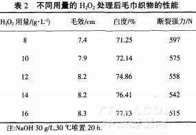這些基團除與色素反應外,也能氧化漿料、膠質等,使毛效也隨之增加,但這種氧化作用也會作用于纖維上,特別是在堿用量較高的條件下,所造成的損傷更大.綜合考慮,雙氧水用量在12~l4g/L時較好.