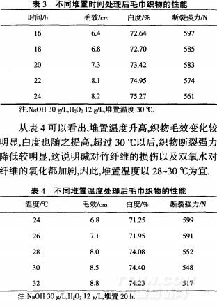 從表3可以看出,堆置時間延長可以提高織物的毛效和白度,但提高幅度較緩,22h后,織物的毛效和白度變化不太明顯,斷裂強力會有一定程度的降低.因此,堆置時間不宜過久,選擇20~22h較為合適.