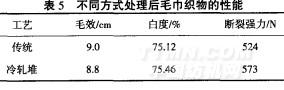 從表5可以看出,采用冷軋堆工藝處理的毛巾織物吸水性和白度同傳統工藝相當,而織物受損情況卻遠遠小于傳統工藝.