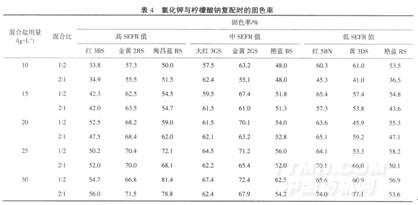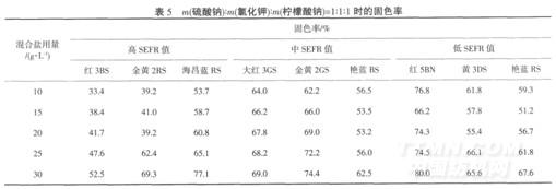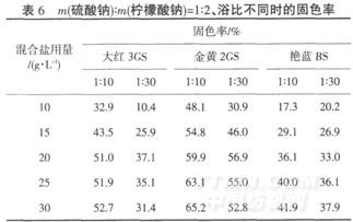 (2)對于特征值中等的染料,在保持其固色率不降低的情況下,鹽用量均有所減少.其中m(硫酸鈉):m(檸檬酸鈉)=1:2時效果最佳,鹽用量減少為常規(guī)用量的1/4,且固色率保持在70%左右.