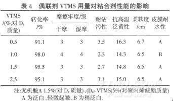 (2)D4+VTMS用量5%(對聚丙烯酸酯質量)反應,其中VTMS用量1.0%(對D4質量),有助于提高膜的耐水性及其與纖維的粘結力.
