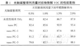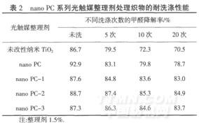 由表2可知,用未改性納米Ti02或nano PC處理的織物洗滌后,其降解VOC的能力下降,且洗滌次數(shù)越多,下降幅度越大,而加入交聯(lián)劑后,光觸媒劑(如nano PC-1、nano PC-2和nano PC-3)由于改性或通過(guò)交聯(lián)劑的作用能使光觸媒劑交聯(lián)或接枝到纖維上,形成共價(jià)鍵結(jié)合,提高了纖維與整理劑的結(jié)合牢度,使得織物降解VOC的耐洗性有較大幅度的提高,經(jīng)20次洗滌后,其降解VOC的能力無(wú)明顯下降,因此,經(jīng)該整理劑處理后織物可獲得較持久的光催化效果.