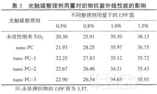 由表3可知,隨著整理劑用量增加,抗紫外線能力提高;1.0%后,抗紫外線能力(UPF值)可超過(guò)35,比未處理織物提高了8倍多.