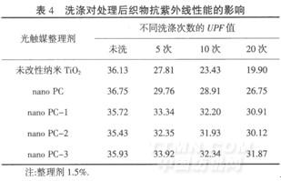 由表4可知,未改性納米Ti02處理的織物洗滌后,其抗紫外線能力顯著下降,且洗滌次數(shù)越多,下降幅度越大.而經(jīng)過(guò)nano PC系列光觸媒整理劑處理的織物,尤其是與交聯(lián)劑復(fù)合的整理劑(如nano PC-1、nanoPC-2和nano PC-3),由于其與纖維發(fā)生了共價(jià)鍵的接枝或交聯(lián)反應(yīng),提高了纖維與整理劑的結(jié)合牢度[10],使得織物的耐洗性有較大幅度提高,洗滌20次后,其抗紫外線能力仍能保持較高值.