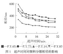 由圖1可知,隨超聲時間延長,顏料粒徑逐漸減小,10min后,粒徑減小趨勢變緩.30min時,P.Y.14和P.Y.83的粒徑比P.Y.65和P.Y.73?。蚴荘.Y.14和P.Y.83結構中帶有更多的羧基和甲氧基,有利于顏料分散于水中.