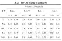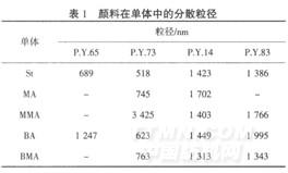 從表l可知,顏料在苯乙烯中的粒徑比較小,原因是在顏料結構中含有苯環,與同樣具有苯環的苯乙烯之間存在一定的相互作用力,而丙烯酸酯類單體結構中沒有苯環,與顏料之間的相互作用力很弱,顏料在丙烯酸酯類單體中較難分散,大體上分散粒徑大于顏料在苯乙烯中的分散粒徑.