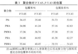 由表3可知,聚合物對P.Y.83的包覆率和包覆效率比P.Y.65高,原因是P.Y.83結構中含有較多的苯環和酯基,與單體之間的疏水作用力較強,單體更易于吸附在顏料表面,并在引發劑下形成聚合物,實現對顏料的包覆.而P.Y.65結構簡單,與單體之間的疏水作用力較小,單體不易于吸附在顏料表面,未吸附的單體會進入表面活性劑膠束,聚合形成聚合物微球,不能實現對顏料的包覆.