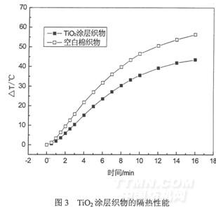 圖3為Ti02涂層織物的隔熱性能。由圖3可知,與空白棉織物相比,經Ti02涂層后,織物的隔熱性能明顯增強;在測試時間內,Ti02涂層織物的內側溫度增加量明顯小于未經Ti02涂層織物的。這是因為Ti02是一種折光指數很高的白色填料,對太陽光中的近紅外輻射具有較強的反射作用,其近紅外反射比可達80%[6]。當Ti02涂覆到棉織物上時,可在棉織物表面形成一層致密的具有近紅外反射作用的PVDF-Ti02高分子膜(圖1所示),它可以將輻射到其表面上的近紅外光大部分以原波長反射到大氣中,并且進入其內部的近紅外輻射還將會在PVDF-Ti02膜內發生漫反射,明顯削弱了透過織物進入內側的熱輻射強度,所以涂層織物內側溫度增加量減少,隔熱性能提高。
