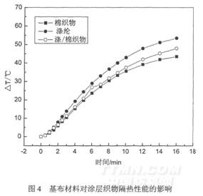 在制備隔熱涂層織物時,基布材料對其隔熱性能的影響是不容忽視的。纖維材料、組織規格、厚度等不同,所制得的涂層織物的隔熱性能也是千差萬別的。圖4為分別以棉織物、滌綸織物和滌/棉織物作為基布材料時,所制得的涂層織物的隔熱性能。
