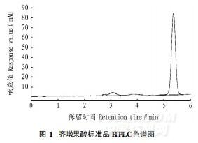 2.1.1線性關系。由圖1可知,齊墩果酸標準品在5~6min出峰,計算得回歸方程為y=24208x-126.8,r=0.9991。結果表明,齊墩果酸在0.2052~1.0260mg/ml范圍內與峰面積呈良好的線性關系。