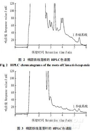 1.2.4樣品含量測定。分別取棉團鐵線蓮根、莖葉供試品溶液進行HPLC測定,進樣量均為10,l平行進樣3次,計算齊墩果酸含量。