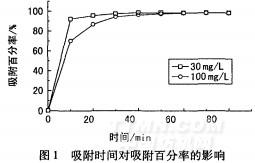 圖1是質量濃度為30mg/L和100mg/L染液(pH值7,25℃)恒溫吸附百分率隨時間的變化曲線。