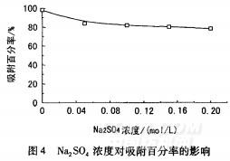 在陽離子染料染色過程中常加入緩染劑Na2SO4,故研究無機鹽NaSO對吸附百分率的影響。圖4是100mg/L染液在pH值7,25℃條件下,Na2SO4濃度對吸附百分率的影響。