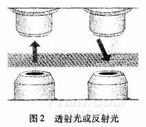 漸減弱。檢測系統分析各種信號變量,并通過計算機算出織物緯斜量。紅外線投光器照射到每個探測頭的光亮度均可以自動和單獨控制。對某些組織緊密的織物,光線很難穿透,可采用反射探測。每個探測頭均有個內藏紅外線光源,可作為反射與穿透光源交替使用。圖2為探測頭的兩種工作狀態。