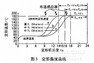 根據烘房情況,在其頂部至少要設置4個非接觸式的紅外線溫度傳感器。不同織物的定形溫度曲線不同,因而需要調整車速來保證定形時間。圖3為8節烘房的定形時間控制曲線,圖中例舉了3種不同織物的定形溫度曲線。