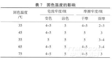 由表7可知,低于55℃,固色反應速率小,吸附到織物上固色劑量少;55℃時,固色效果最好;65℃及以上,雖然固色反應速率增大,但固色劑與纖維的親和力減小,使織物上吸附的固色劑量也減少,造成色牢度下降,因此,固色溫度以55℃為宜.